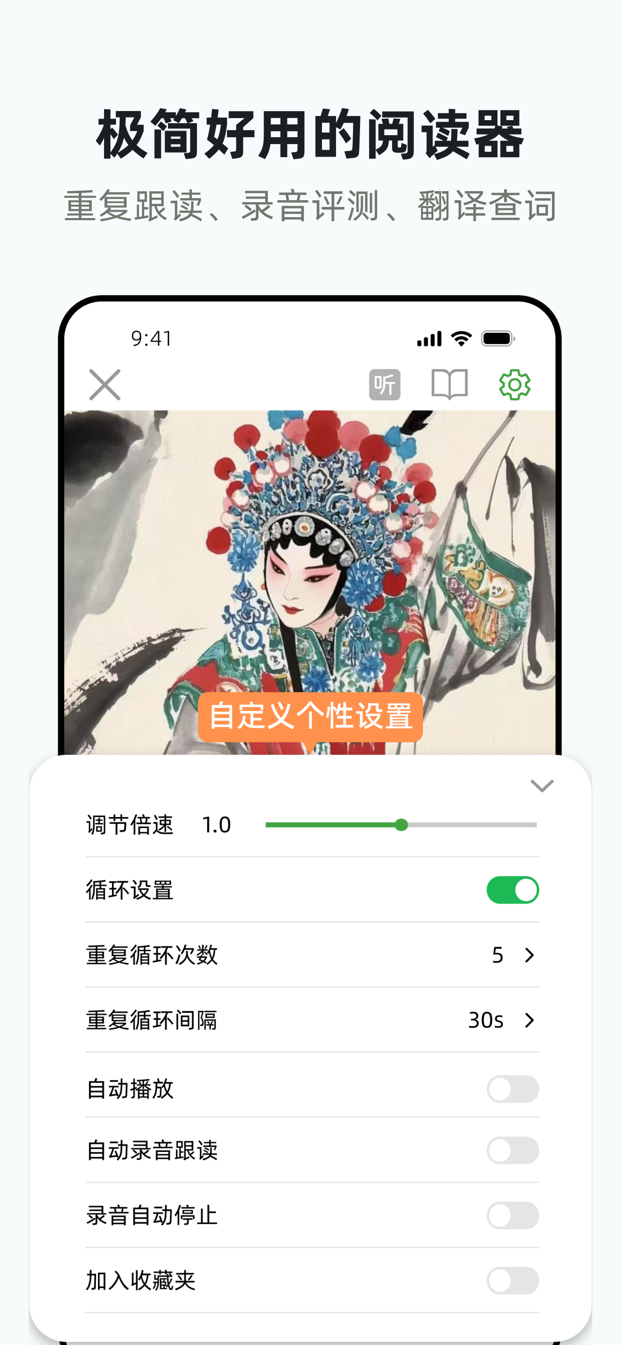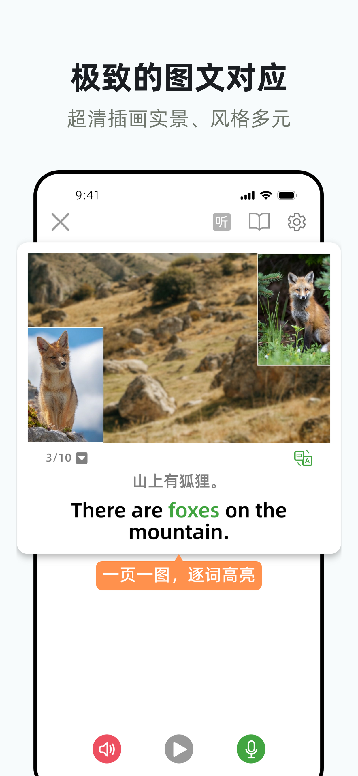 [Personalized Functions Word-by-word highlighting, Chinese translation, word search, single-sentence repetition, adding vocabulary book, recordable voice-over, follow-along reading, AI evaluation, bookmarking, skipping, ear sharpening, and so on.