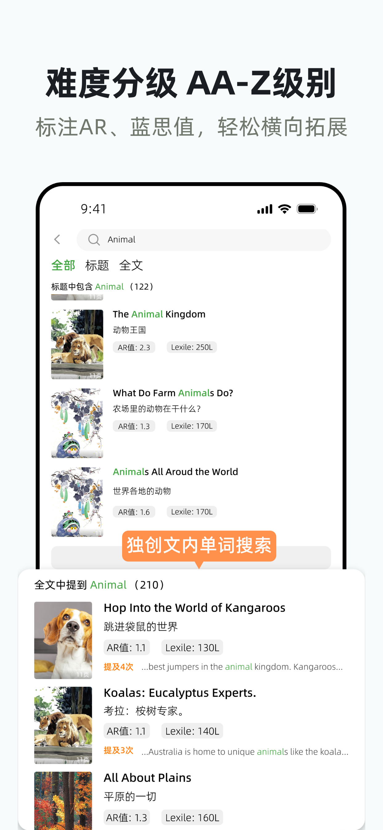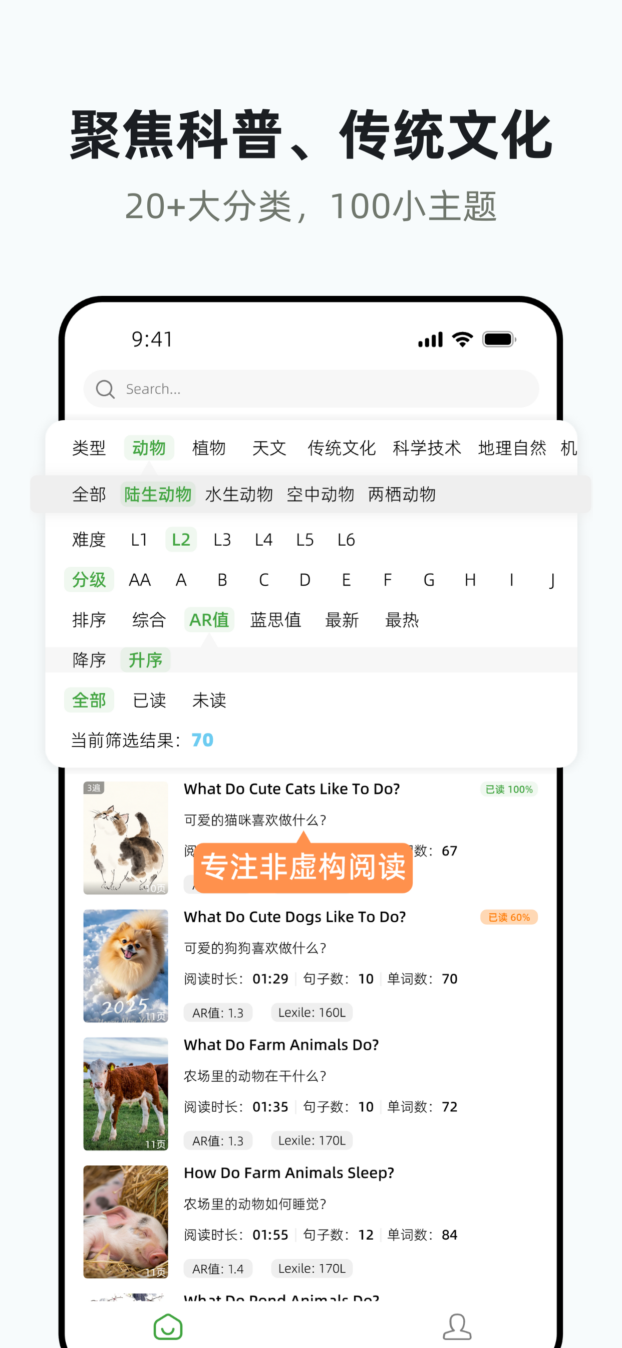 1.【超缓分级爬坡】 全阶科学分级,20+大主题,100+小分类,完全对标RAZ,29个级别,分别标注了AR值和蓝思值,只看适合自己的i+1材料(能读懂80%内容),保证高效输入吸收。